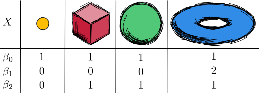 The \(d^{th}\) Betti number counts the number of \(d\)-dimensional holes. It can be used to distinguish between spaces.