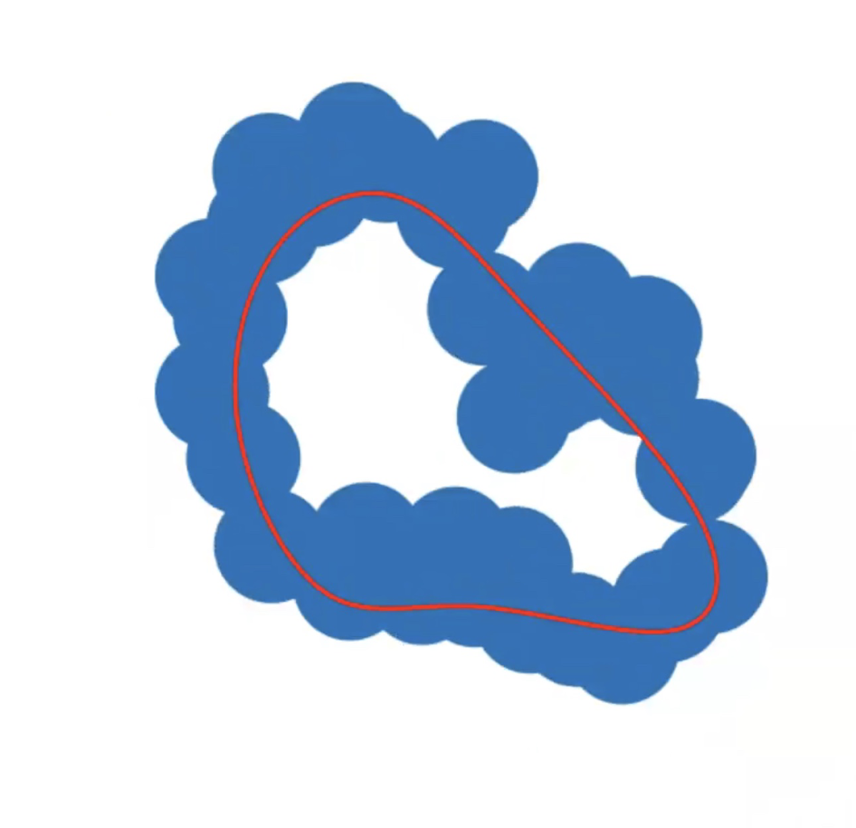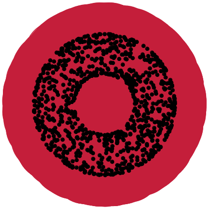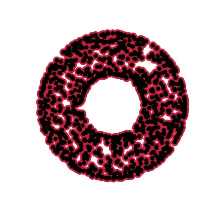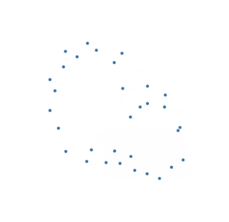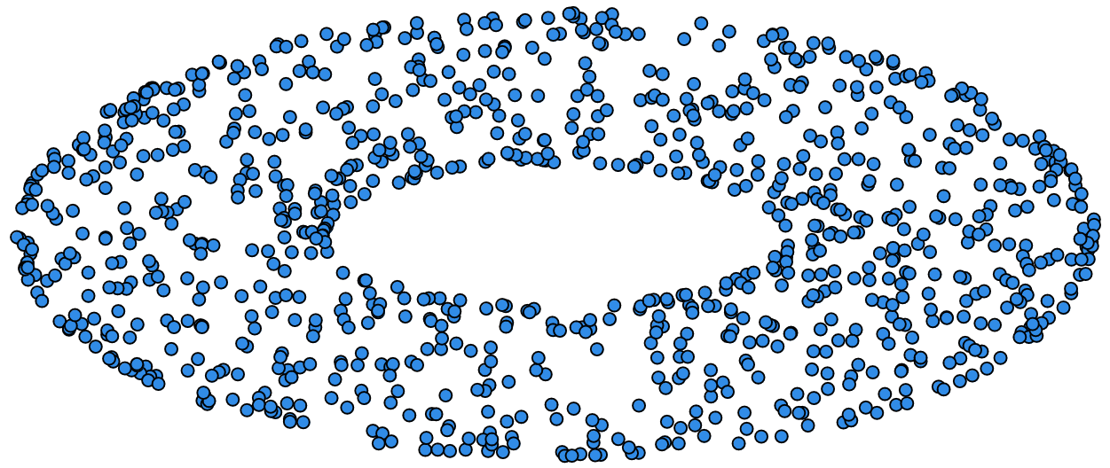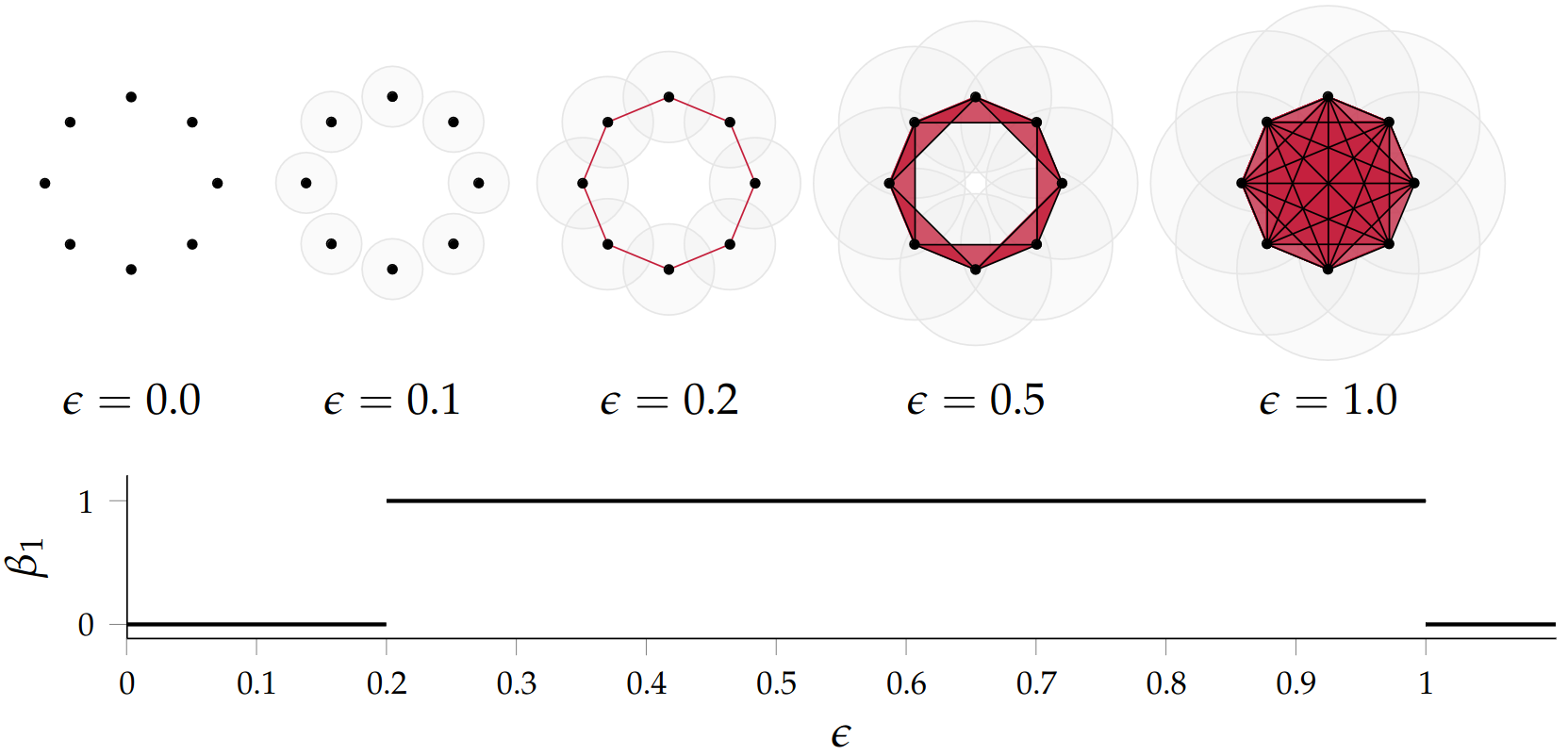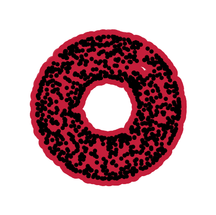 Given a set of points \(\mathcal{X} = \{x_1,\dots,x_n\}\) and a metric \(dist\) (such as the Euclidean distance), pick a threshold \(\epsilon\) and build the Vietoris-Rips complex \(\mathcal{V}_\epsilon\) defined as: