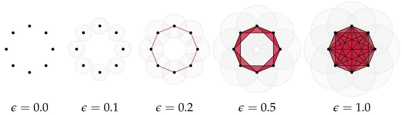 Draw Euclidean balls (circles) of diameter \(\epsilon\) and create a \(k\)-simplex \(\sigma\) for each subset of \(k+1\) points that intersect pairwise.